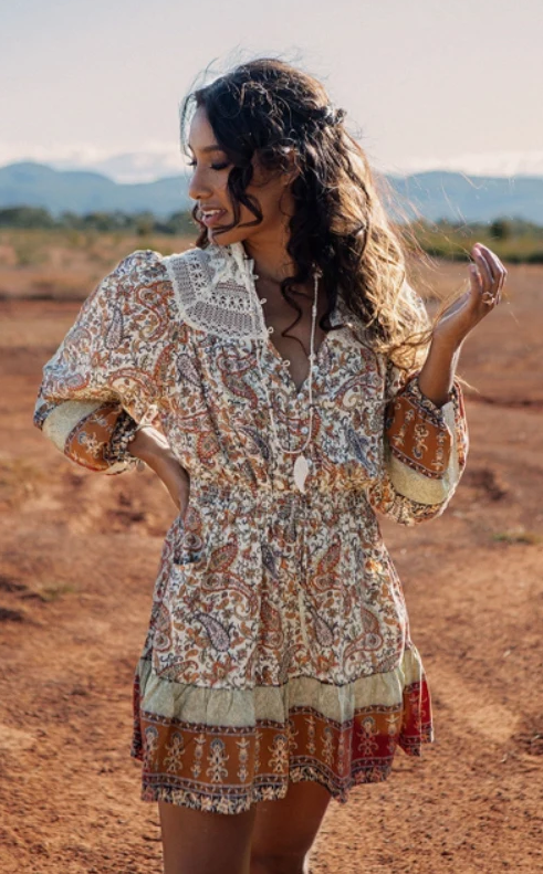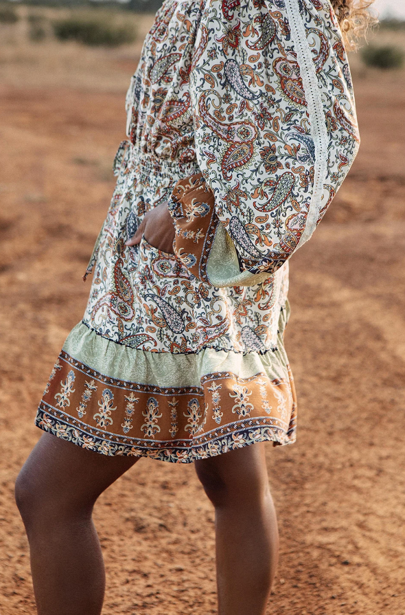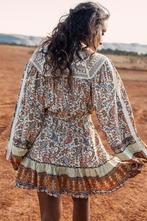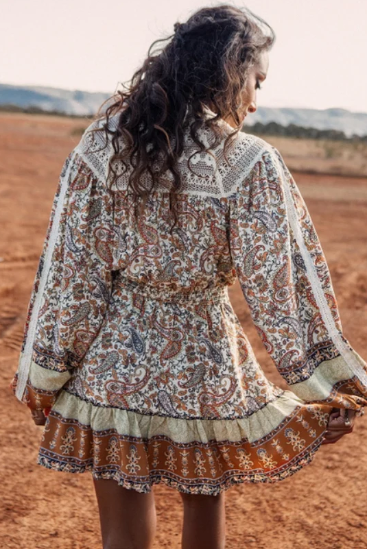 Embrace your bohemian spirit with the Multicolor Split Neck Paisley Ruffle Mini Dress, designed to make you stand out effortlessly. The vibrant paisley print is beautifully highlighted by a delicate lace yoke and a stylish split neckline, adding a subtle yet captivating detail. Long sleeves feature vertical lace trim that enhances the dress’s elegant appeal, while the smocked waistline cinches in to flatter your figure comfortably. Finished with a playful ruffle hemline, this mini dress moves gracefully with you, perfect for festivals, casual outings, or any occasion where you want to express your free-spirited style with confidence and charm.