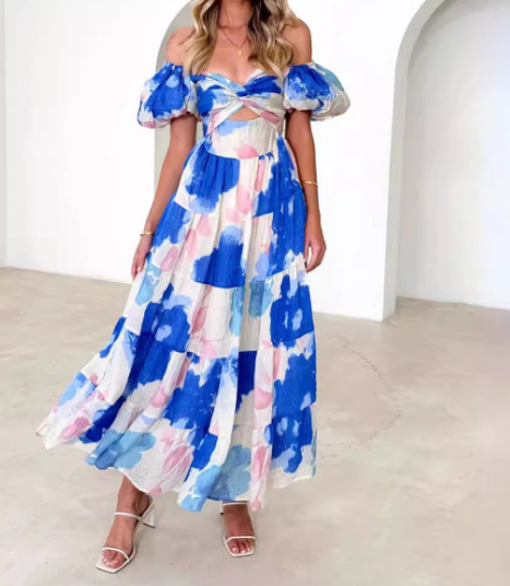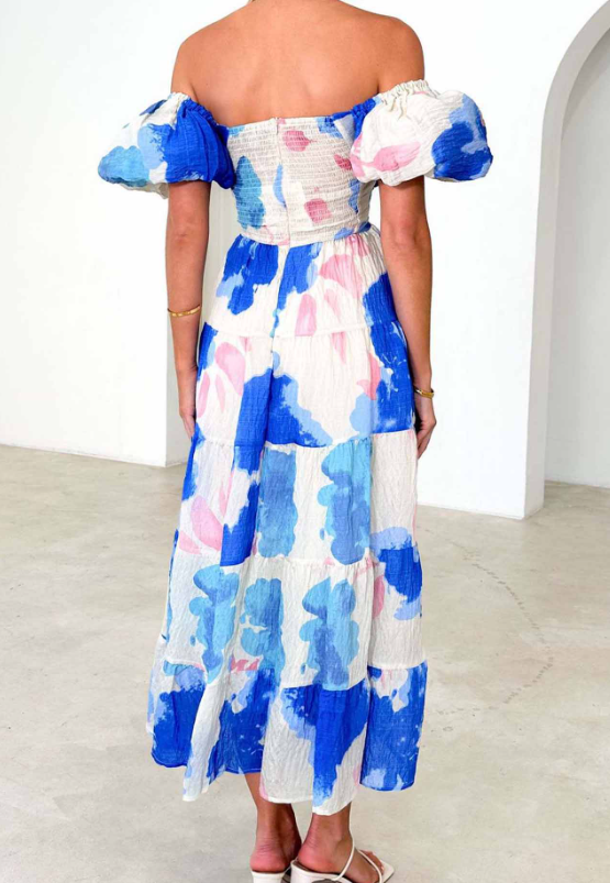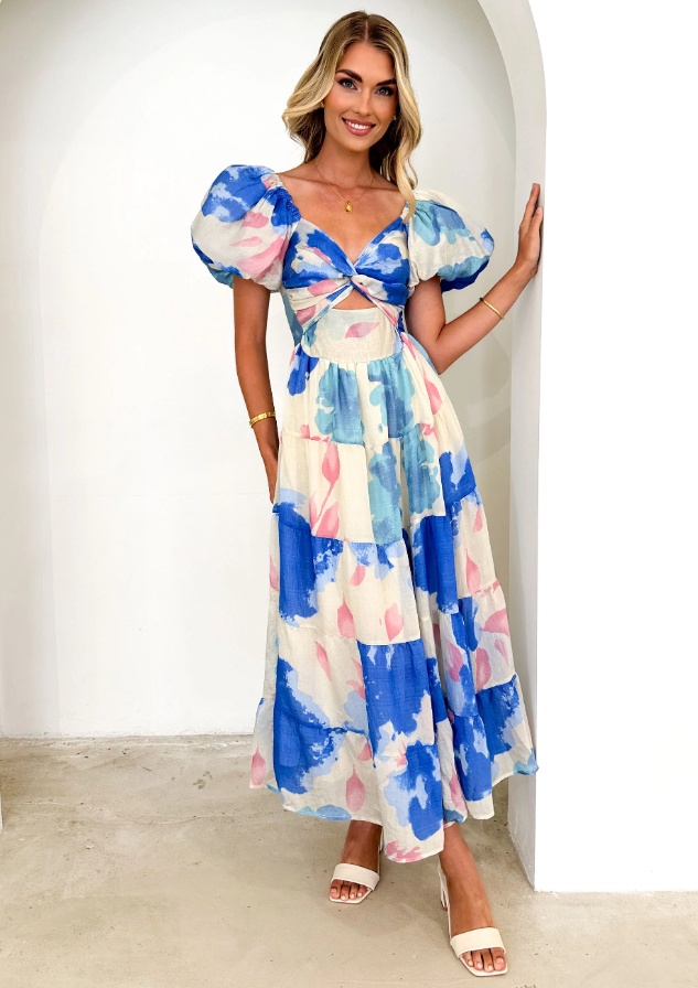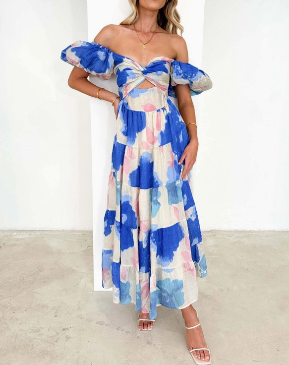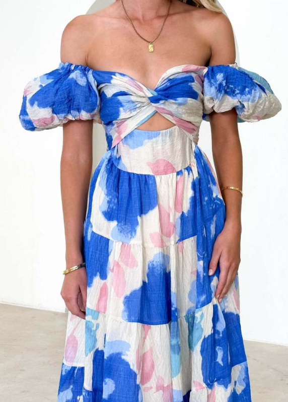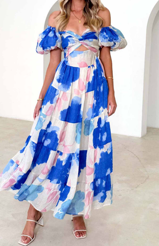 Elevate your style with the Puff Sleeve Off the Shoulder Twist Floral Maxi Dress, a perfect blend of elegance and charm. This dress showcases a flattering sweetheart neckline and romantic puffed sleeves that highlight your shoulders beautifully. The twist front bodice with a subtle keyhole cutout adds a modern, eye-catching detail, while the flowing maxi length ensures graceful movement. Adorned with a delicate floral print in royal, cream, and pink hues, it brings a fresh, feminine touch to your look. Ideal for weddings, garden parties, or special evenings, this dress promises to make you stand out with effortless sophistication.